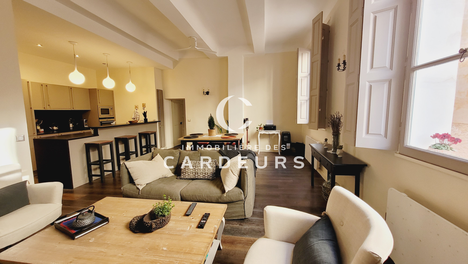 L'agence des Cardeurs vous propose la vente à Aix en Provence, centre ville, Quartier Archevêché, dans un petit immeuble bien tenu d'une rue calme du vieil Aix, au 2ème étage de l'immeuble, grand appartement de type 2 de 72m² habitables comprenant une entrée, salle d'eau, salle de bains, wc indépendant, vaste séjour salle à manger avec cuisine équipée et aménagée, chambre de 20m² avec nombreux rangements, belle hauteur sous plafond, prestations de standing, vendu meublé et équipée. Copro de 8 lots, charges de 1656€/an.